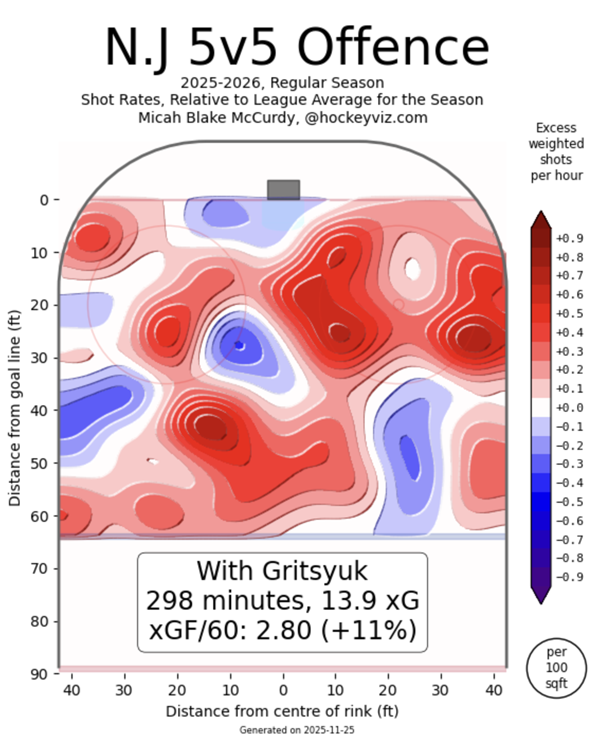Gritsyuk quietly developed into one of the more NHL-ready wingers to arrive from the KHL pipeline, and now that he has transitioned to North America, his game still shows the same blend of pace, skill, and competitiveness that made him stand out overseas. His surface numbers have not fully popped yet, but the underlying metrics tell a different story. His combined on-ice shooting percentage and save percentage (PDO) sits at a very low 948, a number that almost always regresses toward 1,000, suggesting better results are coming. Per HockeyViz, the Devils generate more offense with Gritsyuk in the lineup, reinforcing that the process is strong even if the finishing has lagged.