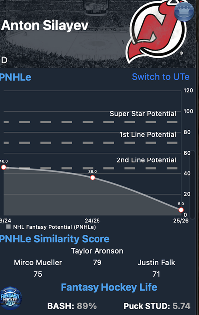 While the real-life value is obvious, the fantasy translation is a different story. Silayev does post strong blocks, shots, and hits, giving him solid BASH peripherals, but those contributions are easy to find on the waiver wire. What differentiates fantasy assets is scoring, and so far, that has not been part of Silayev’s game. Across one hundred fifty-six KHL games, he has only twenty-four points. His pNHLe has cratered to five, which reflects the extremely limited offensive projection. He will almost certainly be an important piece for the Devils and play heavy minutes, but if he is not producing points, his fantasy ceiling remains low. Given the name recognition, draft pedigree, and how excited the Devils are about his role, now is the ideal moment to sell high and acquire a more impactful long-term asset.