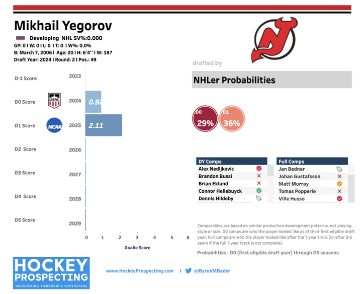 The Devils have been searching for long-term stability in net for years, and Mikhail Yegorov may finally be the prospect who changes that trajectory. His combination of size, poise, and technical control gives him a foundation that already looks near professional ready. He tracks pucks through layers, moves efficiently in his crease, and rarely gets rattled.