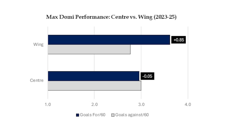 First, let’s consider how the Maple Leafs score and concede goals depending on which position Domi is playing. At centre, the Leafs are underwater with Domi down the middle of the lineup, but barely. At wing? Toronto is just under a goal per 60 minutes better than the opposition, a stark difference: