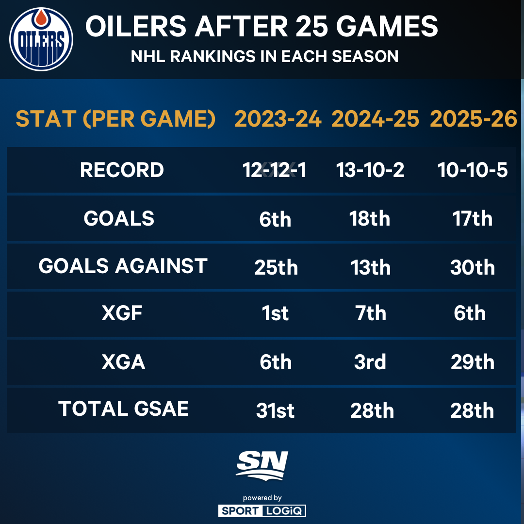 The major difference between this season’s start and the other two is the performance of the defence. The Oilers rank 29th in expected goals against per game — a steep decline from the previous two seasons through 25 games.