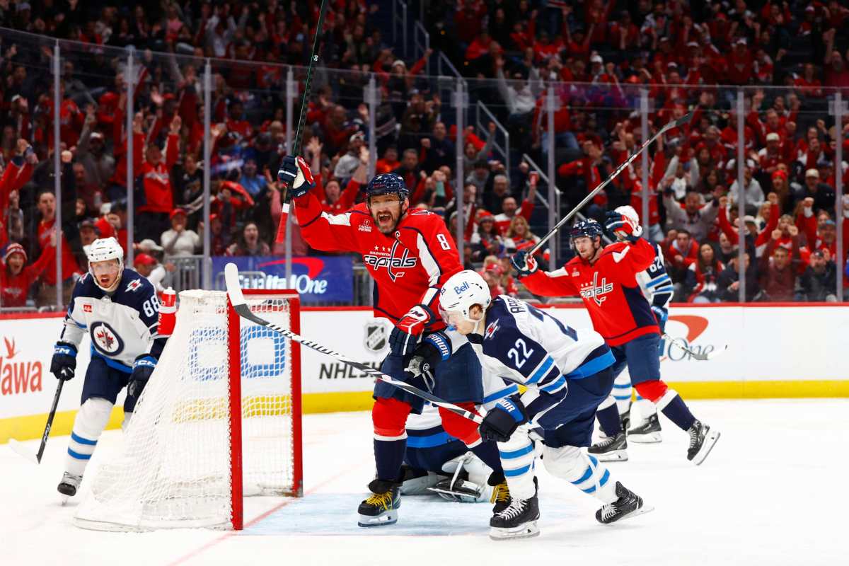 Mar 24, 2024; Washington, District of Columbia, USA; Washington Capitals left wing Alex Ovechkin (8) celebrates after scoring a goal against the Winnipeg Jets during the third period at Capital One Arena. Mandatory Credit: Amber Searls-USA TODAY Sports