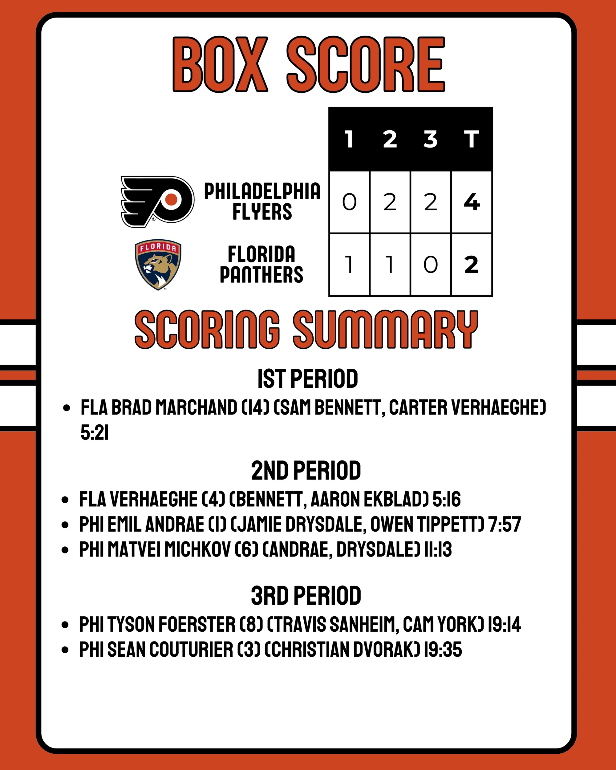 But once again, the resilience shone through for the Orange and Black. After erasing a 2-0 deficit in the second period, Tyson Foerster scored in the final minute of the third to decide the game, lifting the Flyers to a 4-2 win over the Florida Panthers.