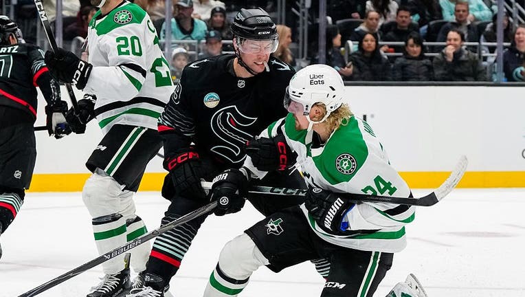 SEATTLE, WASHINGTON – NOVEMBER 26: Vince Dunn #29 of the Seattle Kraken clashes with Roope Hintz #24 of the Dallas Stars during the second period of a game at Climate Pledge Arena on November 26, 2025 in Seattle, Washington. (Liv Lyons / NHLI / Getty Images)
