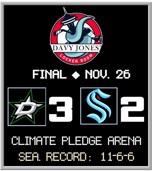 The Kraken couldn’t convert on a late power play or pulling Daccord for a sixth attacker. Seattle outshot Dallas, 29-21, holding the Stars to two SOG in the final 20 minutes.