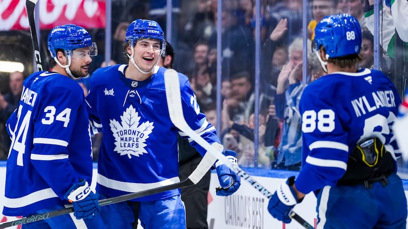 Auston Matthews William Nylander Matthew Knies TORONTO, CANADA – OCTOBER 16: Auston Matthews #34 and William Nylander #88 congratulate Matthew Knies #23 of the Toronto Maple Leafs on scoring a goal during the first period against the New York Rangers at the Scotiabank Arena on October 16, 2025 in Toronto, ON, Canada. (Photo by Thomas Skrlj/NHLI via Getty Images) (Thomas Skrlj/NHLI via Getty Images)