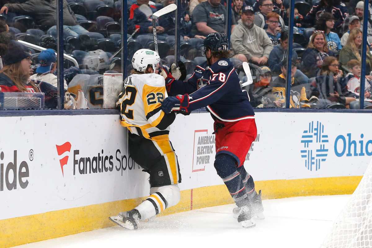 Sep 24, 2023; Columbus, Ohio, USA; Columbus Blue Jackets defenseman Damon Severson (78) checks Pittsburgh Penguins right wing Sam Poulin (22) during the third period at Nationwide Arena. Mandatory Credit: Russell LaBounty-USA TODAY Sports