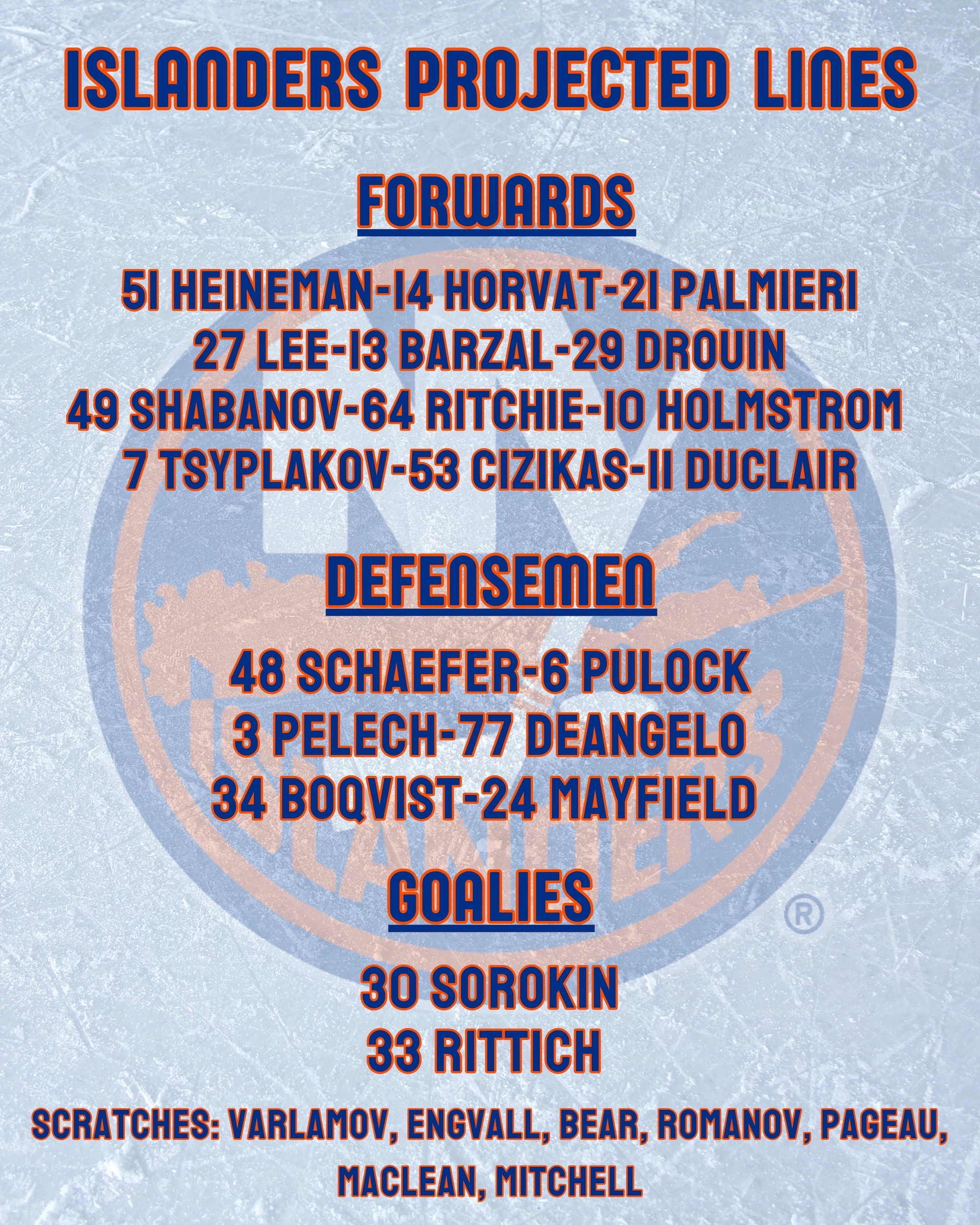Ilya Sorokin is expected to start for the Islanders. Sorokin took the loss in his last start, allowing three goals on 14 shots to the Bruins on Wednesday night.