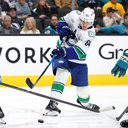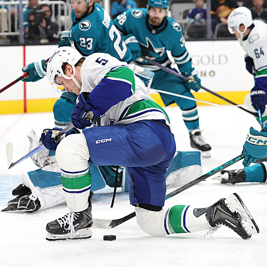 Canucks defenseman Tom Willander attempts to control the loose puck – Photo by Jack Lima