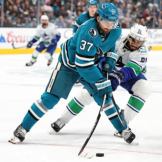 Canucks forward Evander Kane (91) forechecks Sharks defenseman Timothy Liljegren (37) as he attempts to move the puck – Photo by Jack Lima