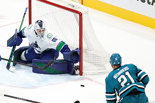 Canucks goalie Nikita Tolopilo stops a shot from Sharks forward Alexander Wennberg (21) – Photo by Jack Lima