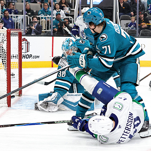 Canuks defenseman Quinn Hughes (43) checks Sharks forward Colin Graf (51) into his goalie Nikita Tolopilo – Photo by Jack Lima