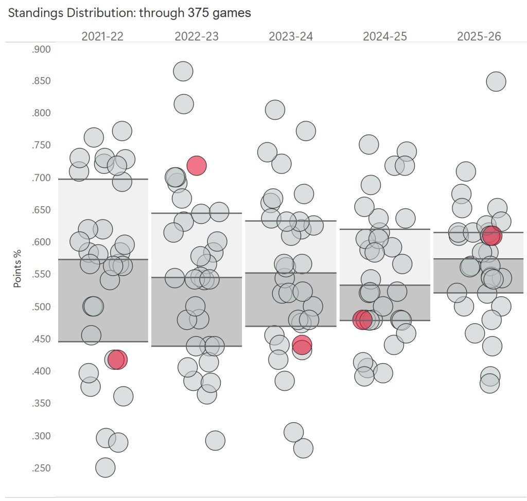 In the Eastern Conference, the standings are extremely tight, with every team within five points of a playoff spot. Four teams are tied for the final wild card spot, so the playoff picture can shift any night.