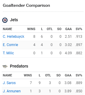 Both the Jets & Predators played on Friday night and had to travel to Nashville for today’s game, with Winnipeg coming from North Carolina and the hometown club flying in from Illinois. Let’s continue our look at Winnipeg & Nashville by checking out ESPN‘s team & goaltender comparison numbers for tonight’s late night game (yet another 9:00 pm Central start):