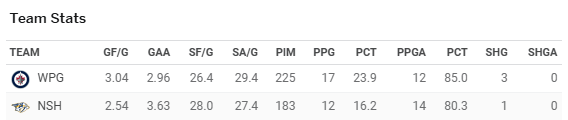 Nashville has scored the least amount of goals so far this season (62), which is 9 less than the 26th ranked Winnipeggers (71). The Jets are tied for the 7th least goals against (68) while the Predators find themselves tied with the Toronto Maple Leafs for the 4th most (87).