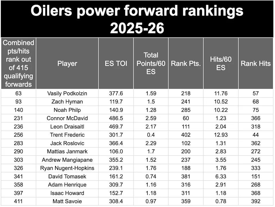 As it stands now the Oilers don’t have a true power forward, no one who ranks in the Top 50 if you combine points production with hitting rates at even strength.