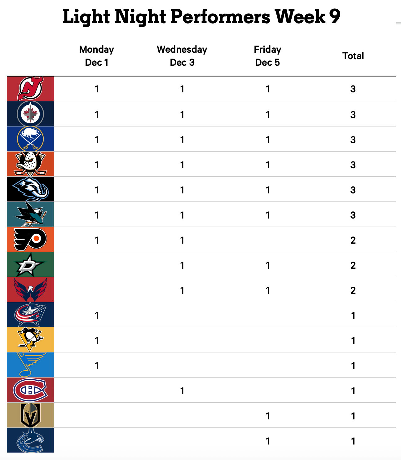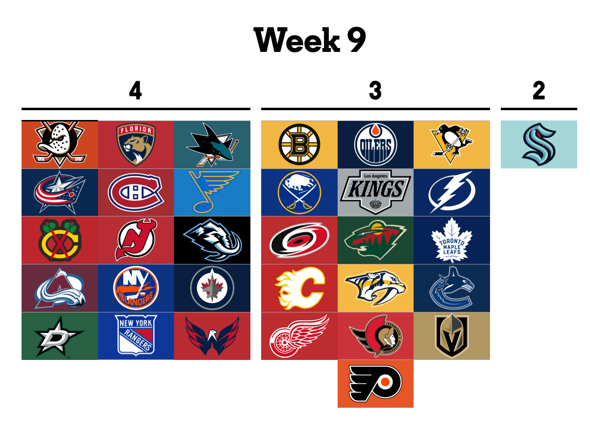Remember when I kicked Mason McTavish in last week’s column? Apparently, he took that personally with four points in three games since. But the real fantasy gem as of late is Sennecke, who extended his point streak to seven games on Sunday in Chicago. The rookie was putting up points with Cutter Gauthier and Leo Carlsson on the top line. Then on Saturday, he was productive on a new-look second line with McTavish and Chris Kreider. With four appearances in Week 9 (three on light nights), the Ducks are a team to target.