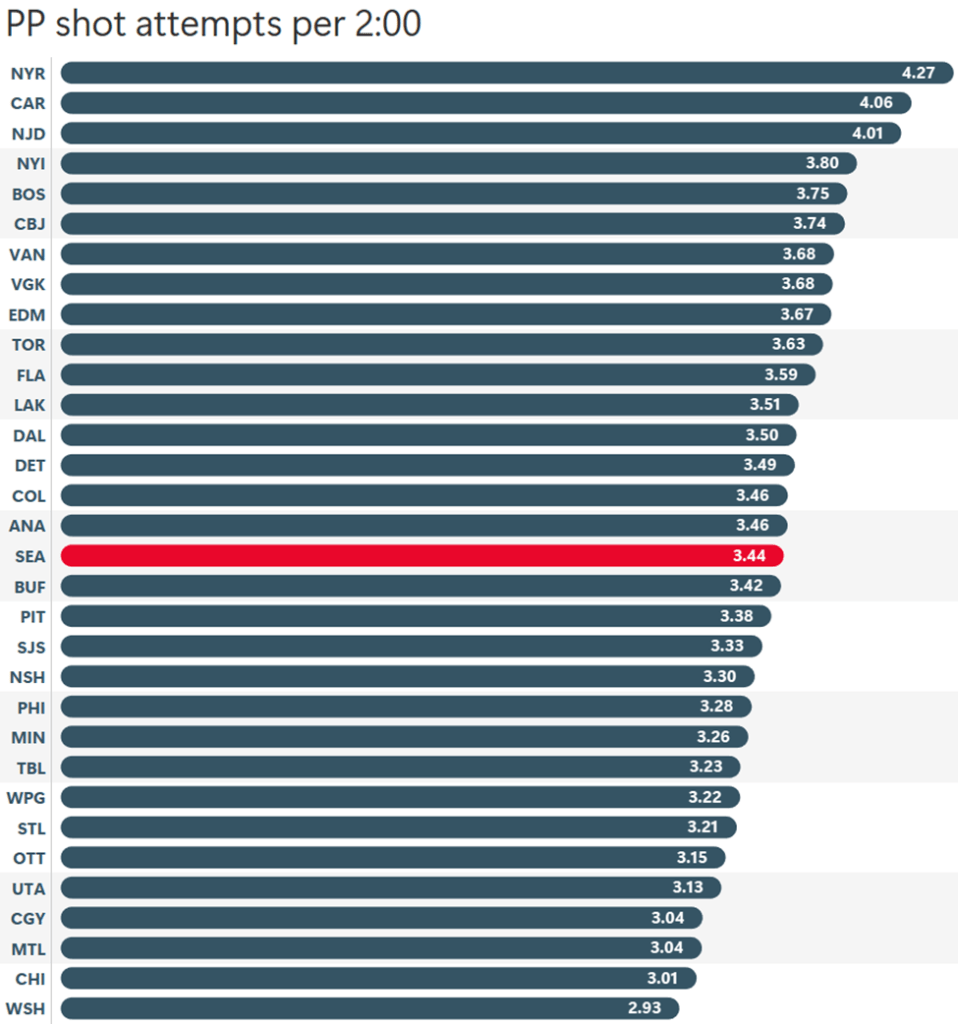 First, I wanted to see whether they really did generate a lot of shot attempts on Saturday. The Kraken had 22 power-play shot attempts, their second-highest total in a game this season. It was also their second-highest total power-play time, so to evaluate it better, I calculated shot attempts per two minutes of power-play time. That came out to 4.29 attempts. It’s not their highest rate of the season, but it’s close.