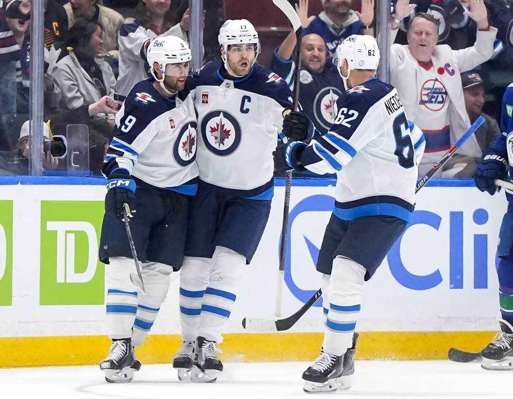 Lowry, centre, celebrates a Winnipeg Jets’ goal with linemates Alex Iafallo, left, and Nino Niederreiter against the Vancouver Canucks on November 11.