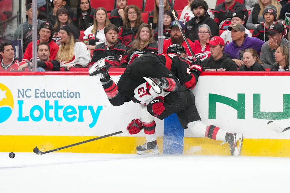 Oct. 9: Carolina Hurricanes left wing Jordan Martinook (48) checks New Jersey Devils center Nico Hischier (13) during the third period at Lenovo Center.