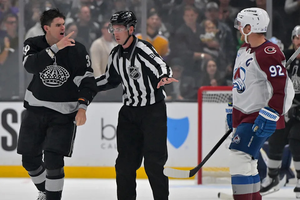 Oct 7: Los Angeles Kings left wing Jeff Malott (39) points to Colorado Avalanche left wing Gabriel Landeskog (92) after he finished fighting Josh Manson during the first period at Crypto.com Arena.
