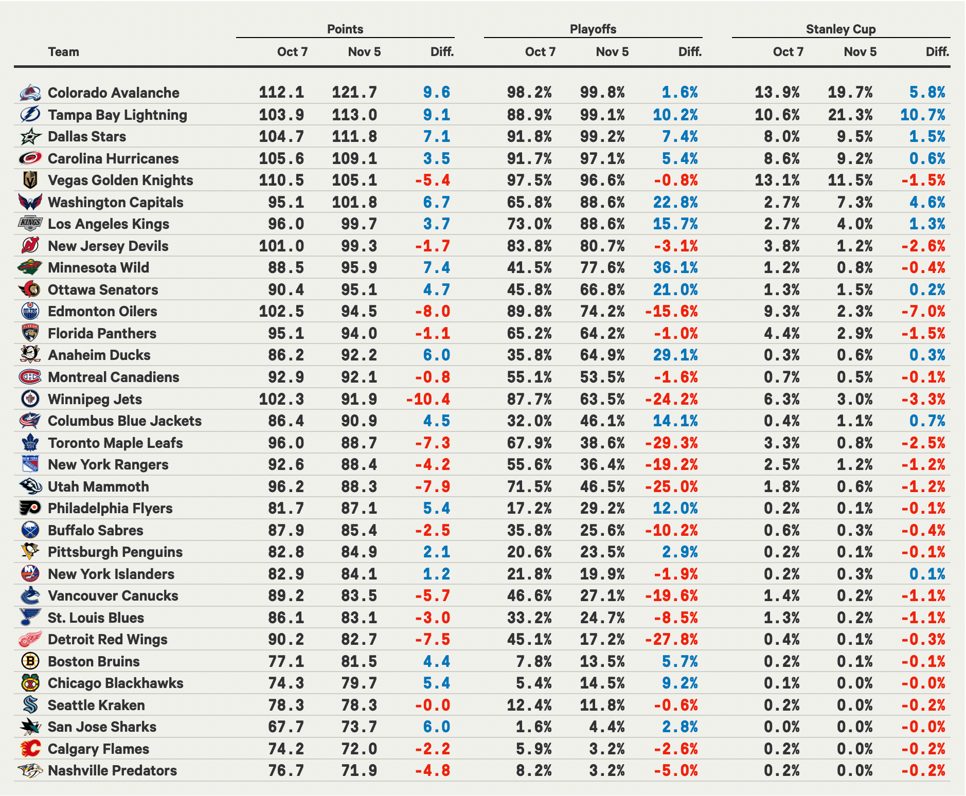 Some people questioned Tampa Bay’s high standing after a modest start to the season. Those questions have been silenced: The Lightning are a wagon. No team saw a larger rise in its Stanley Cup chances over the last month than Tampa Bay, which went 10-2-0 while outscoring teams 47-29. The Lightning look like the clear-cut favorite in the East and the No. 2 team in the league behind Colorado (though with an easier path in the East).
