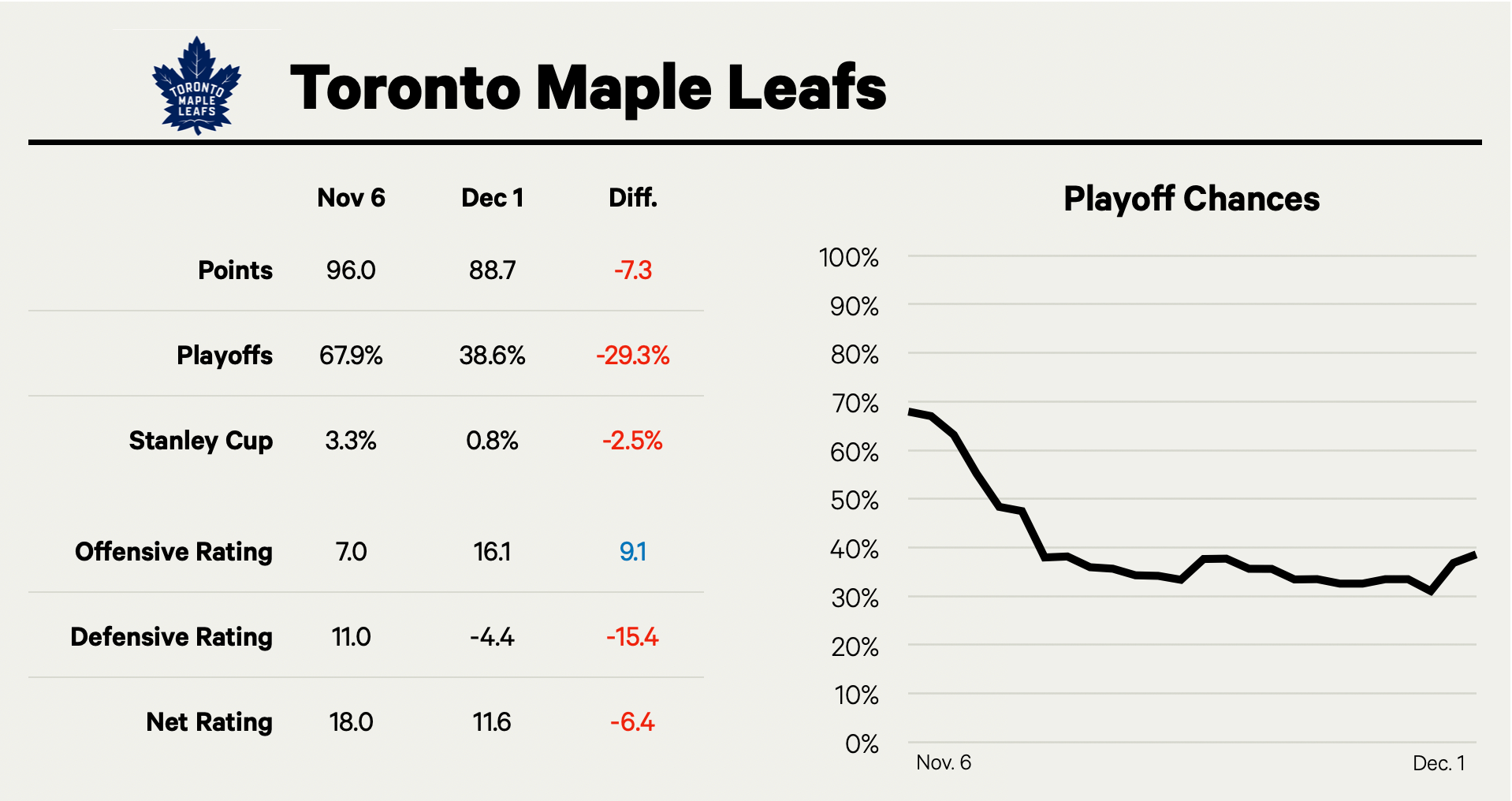 Seven teams saw their playoff chances drop by 15 percentage points over the last month and four of them were from Canada. The Leafs were highest at minus-29 percent followed by Winnipeg (minus-24 percent), Vancouver (minus-20 percent) and Edmonton (minus-16 percent). Calgary’s chances were already cooked and a 5-5-2 record wasn’t saving the Flames.