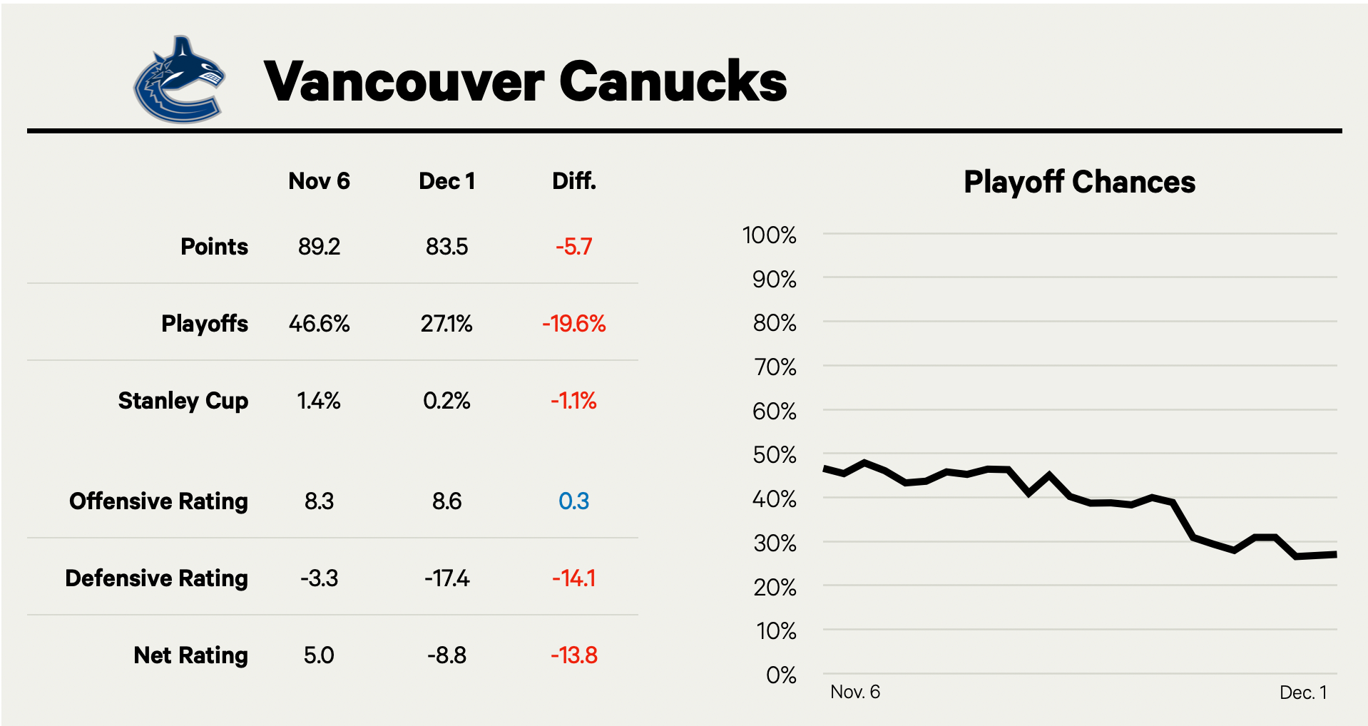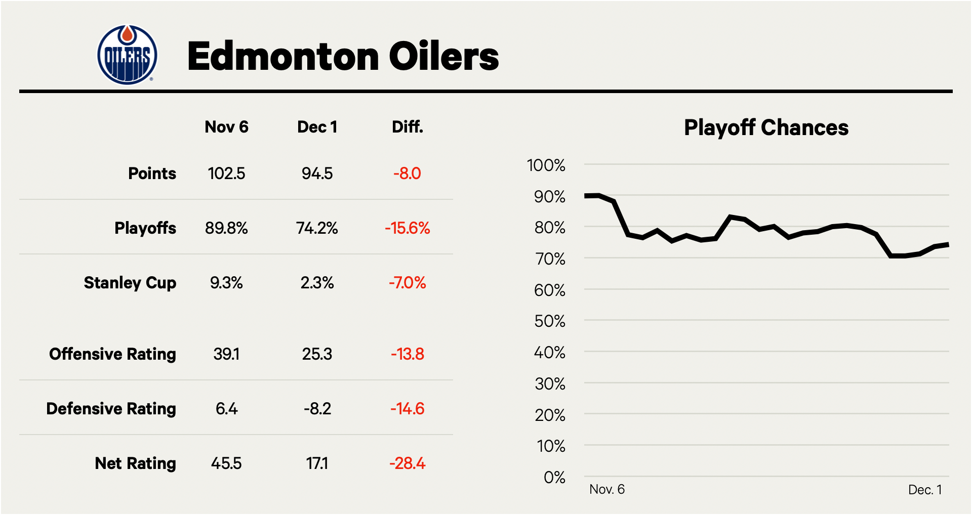 To sum it up: the Oilers aren’t a contender anymore, the Jets are a mess without Hellebuyck, the Leafs and Canucks can’t defend and the Flames can’t score. Woof. One month ago, Canada had a 22 percent chance of ending the country’s Stanley Cup drought. That’s down to eight percent now.