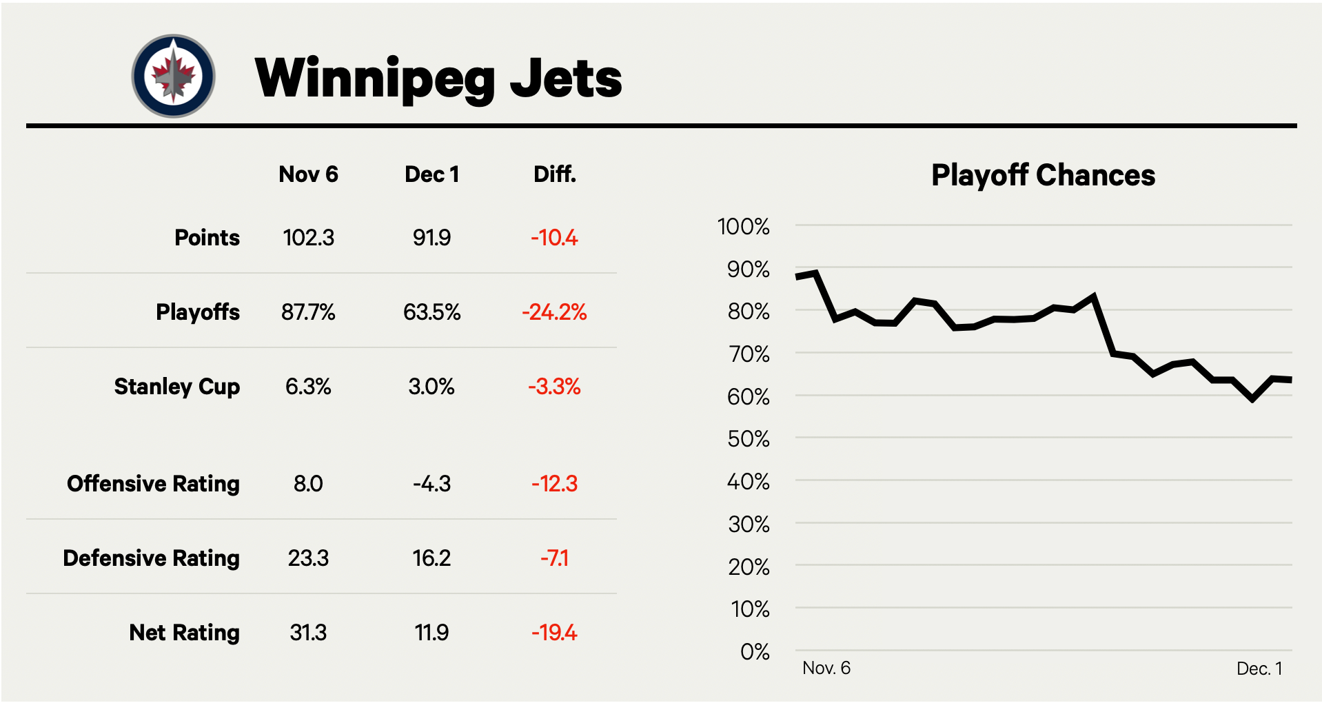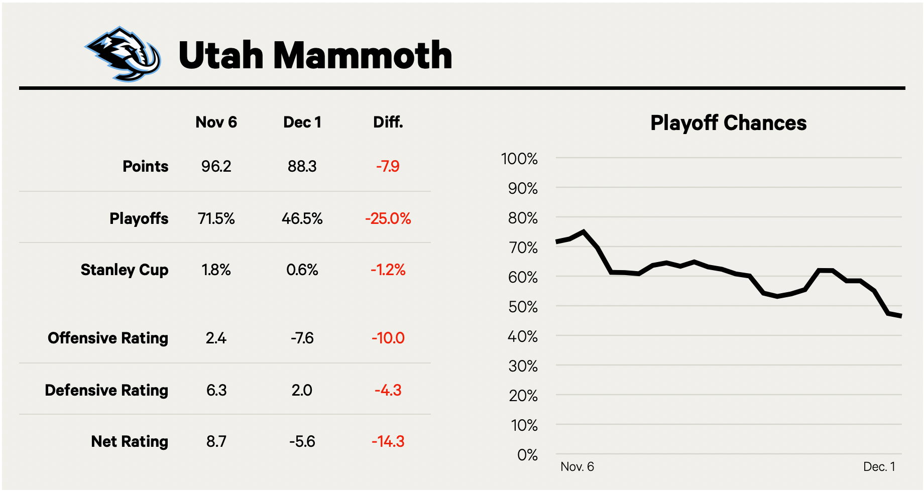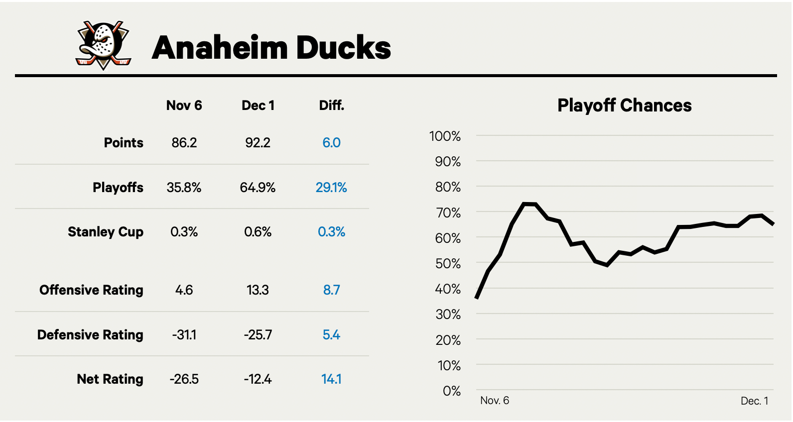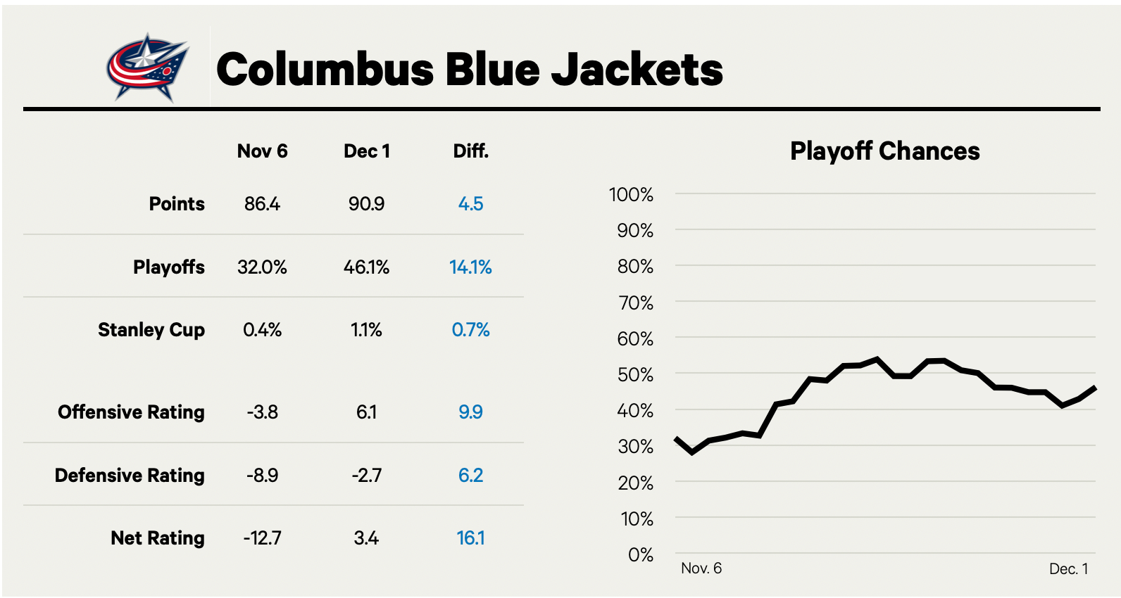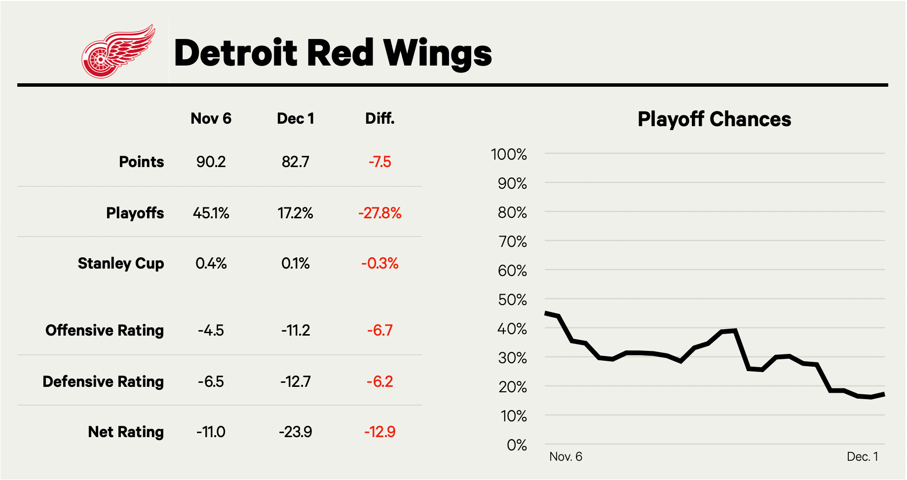 The Red Wings were on the rise to start the season, but have fallen back down to earth in November after a disappointing 4-6-2 run against the third-easiest schedule. That’s dropped Detroit’s playoff chances substantially by 28 percentage points.
