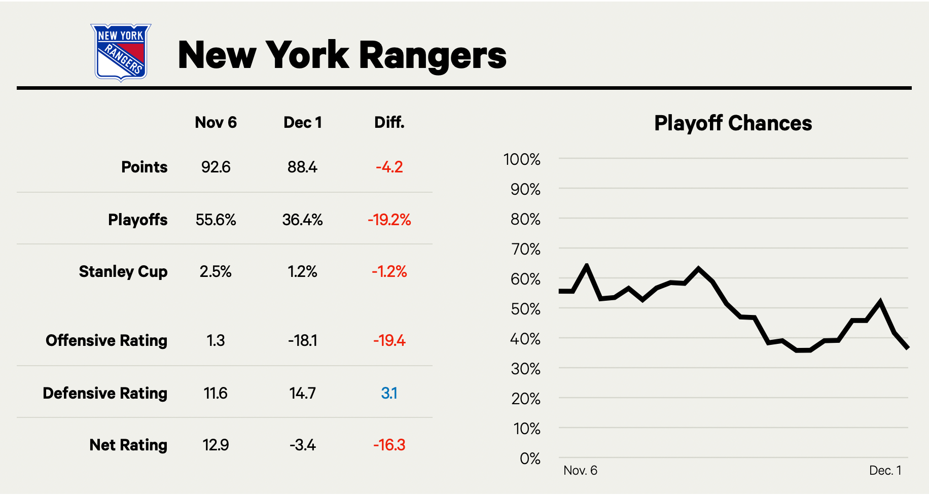 With the Rangers under Mike Sullivan, the biggest question is whether this team can score enough. A lot of the top six got back on track in November, but the rest of the team is a mess. The Rangers’ top six scored 30 goals in November, the rest of the team combined for 10 — and that’s led by three goals from defensive defenseman Vladislav Gavrikov. That’s led to some downgrades where the team’s bottom six now has a projected Offensive Rating of minus-45, the worst mark in the league.