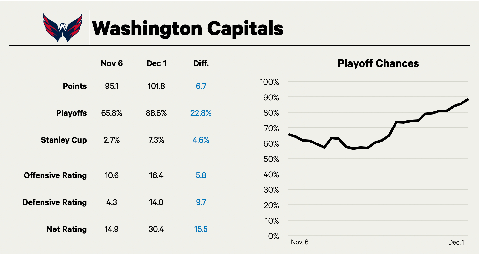 Put it all together and the Capitals not only look like a solid playoff bet again, but one of the top teams in the East. Only two teams saw their Cup chances grow more over the last month. That they had such a strong month despite the league’s second-hardest schedule over the last month also plays a part in that.