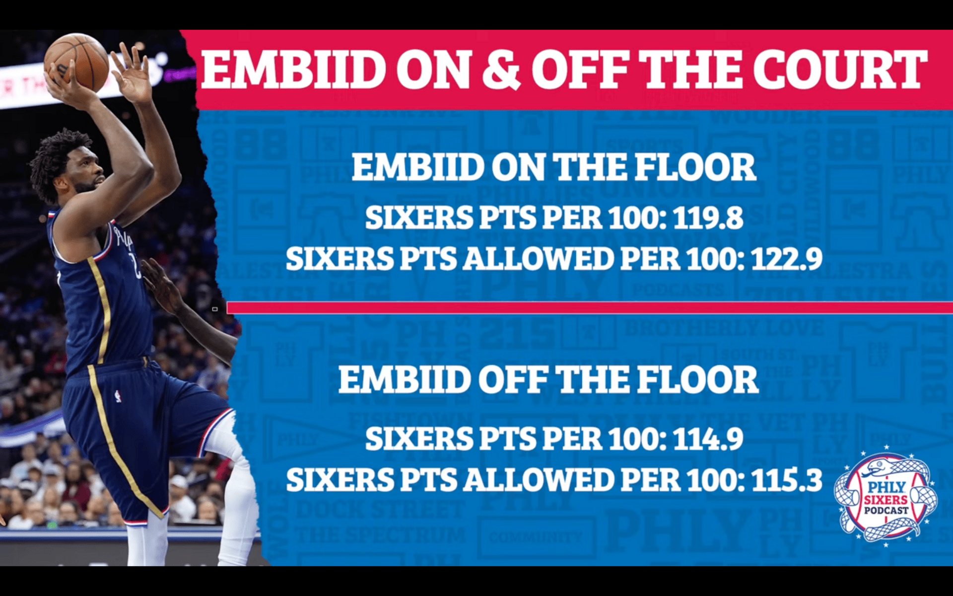 But number two, Embiid is so incredibly bad on defense right now. The Sixers are a very good offensive team when Embiid plays, pretty much at their best. But the Sixers are a very bad defensive team when Embiid plays, pretty much at their worst. The stats spell those two things out.