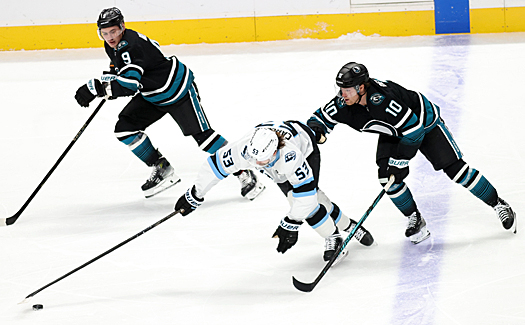 Mammoth forward Clayton Keller (9) makes a pass between Sharks defenders Timothy Liljegren (37) and Ty Dellandrea (10) – Photo by Jack Lima