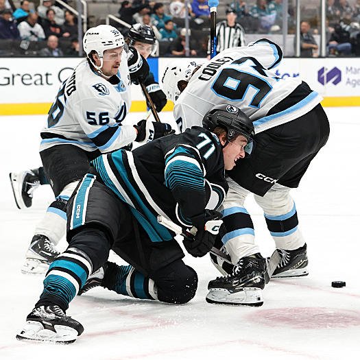 Sharks center Maklin Celebrini (71) battles Mammoth players Kailer Yamamoto (56) and Logan Cooley (92) for the puck after a faceoff – Photo by Jack Lima