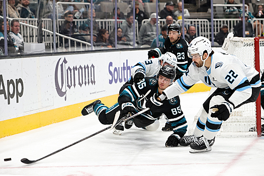 Mammoth forward Michael Carcone (53) moves the puck between Sharks defenders Dmitry Orlov (9) and Ty Dellandrea (10) – Photo by Jack Lima