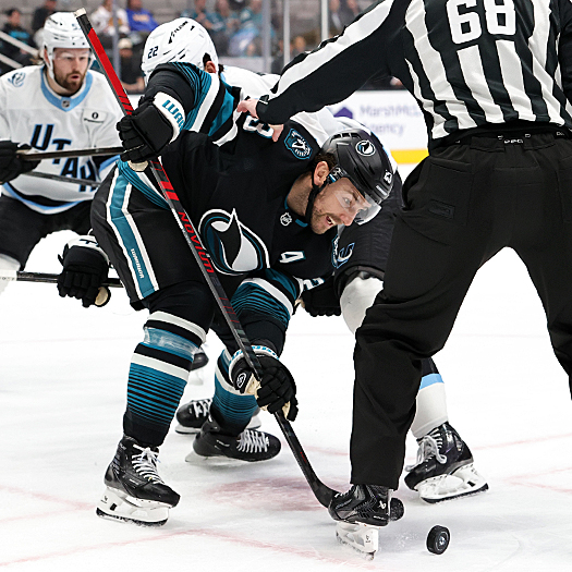 Sharks forward Barclay Goodrow (23) wins a faceoff against Mammoth center Jack McBain (22) – Photo by Jack Lima