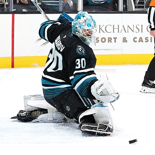 Sharks goalie Yaroslav Askarov makes a kick save during second period action – Photo by Jack Lima