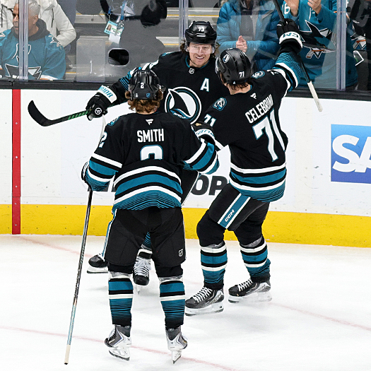 Tyler Toffoli (center) celebrates his first period goal with teammates Will Smith (2) and Maklin Celebrini (71) – Photo by Jack Lima
