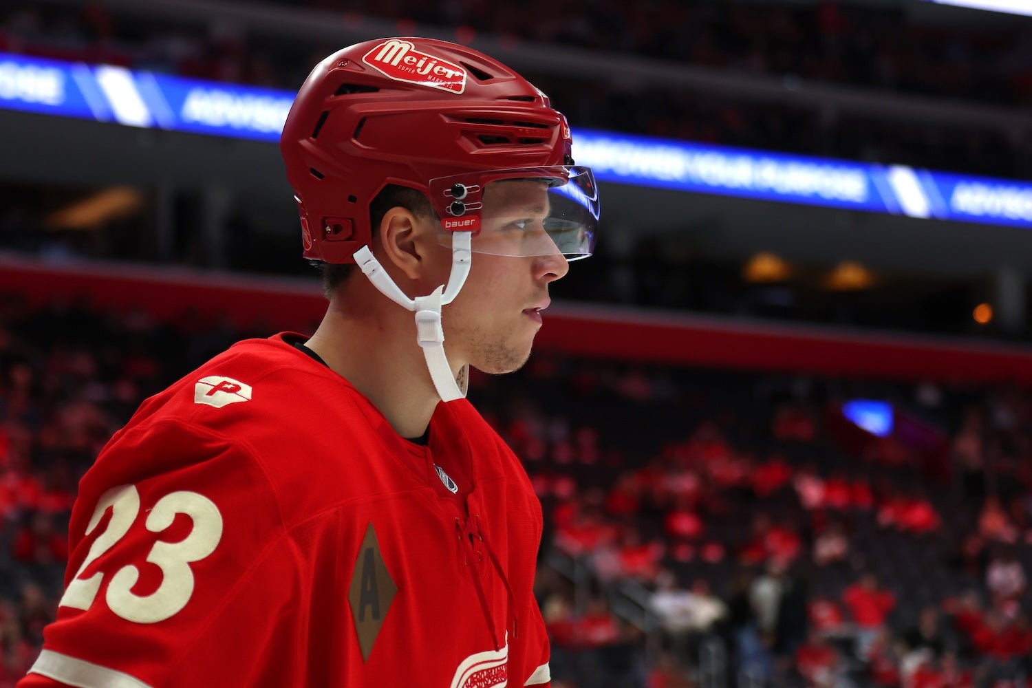 DETROIT, MICHIGAN – OCTOBER 09: Lucas Raymond #23 of the Red Wings plays against the Canadiens at Little Caesars Arena on October 09, 2025. (Gregory Shamus/Getty Images)