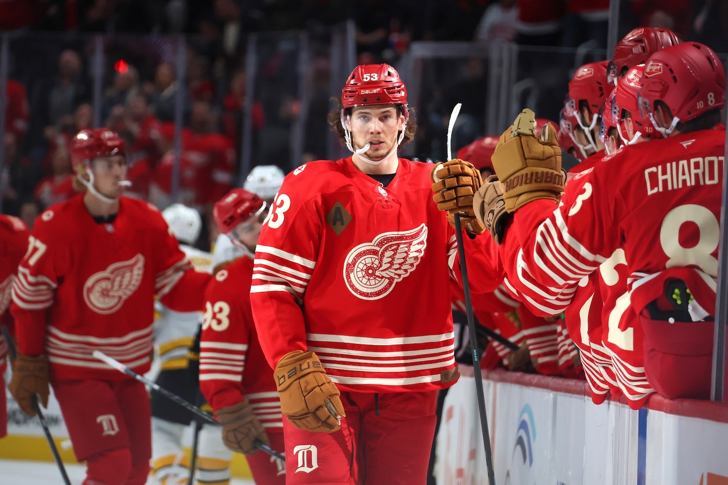 DETROIT, MICHIGAN – DECEMBER 02: Moritz Seider #53 of the Red Wings celebrates after scoring a goal against the Bruins at Little Caesars Arena on December 02, 2025. (Gregory Shamus/Getty Images)