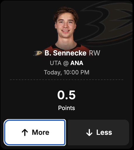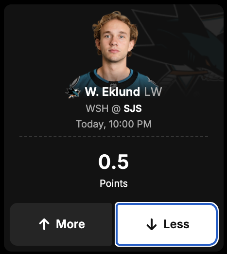Create a Pick Set by choosing 2+ players from the same sport and Pick Group (a set of picks available from a group of set competitions). For each player, simply select if you think they’ll have more or less than their listed stat projection. In each Pick Set, you can not pick the same player twice and you must pick players from at least two different teams.