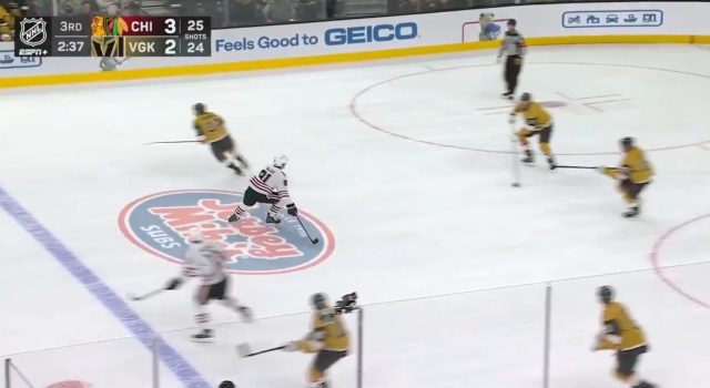 Let’s take a longer look at that late VGK goal because the play seemed so harmless at first. Nine seconds after this low-quality screenshot below, the puck ends up in the back of the Hawks net. You’ll see that all five VGK skaters are on the screen and only one Hawk is applying any sort of pressure in Nazar. Moore is the one below the Jersey Mike’s logo, skating towards his own end.