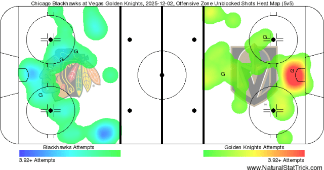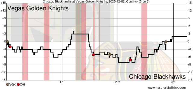 Vegas tied the game later in the second with another goal off a Blackhawks defender, this time a Ben Hutton slapper that clanked in off of Matt Grzelcyk: