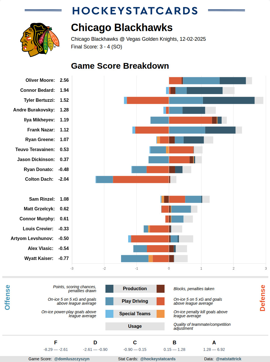 In the last recap, LBR suggested the Hawks should give Bertuzzi-Nazar-Moore another look after they fared well in a limited sample against the Ducks, and the sample from this game offers additional support for that. In 10:25 of ice time together, it was an even 8-8 in shot attempts but was up 7-1 in scoring chances and 4-1 in high-danger chances, helping it tally an expected goal share of 61.05 percent. It scored twice but did allow the game-tying goal late in the third, as we’ll discuss in a bit. Still, plenty of positive signs from this group.