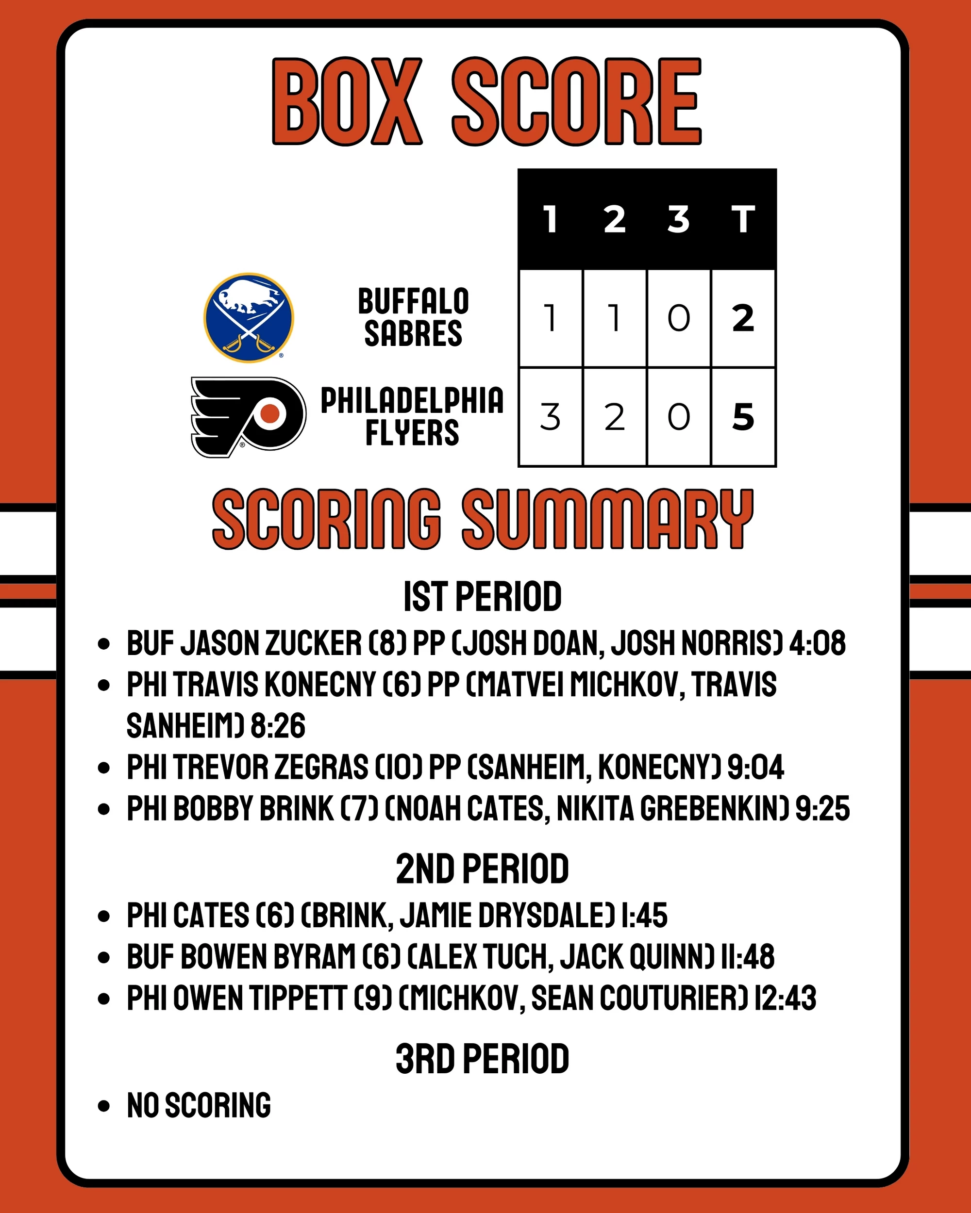 Five Flyers finished with multi-point games: Brink, Konecny, Cates, Matvei Michkov, and Travis Sanheim.
