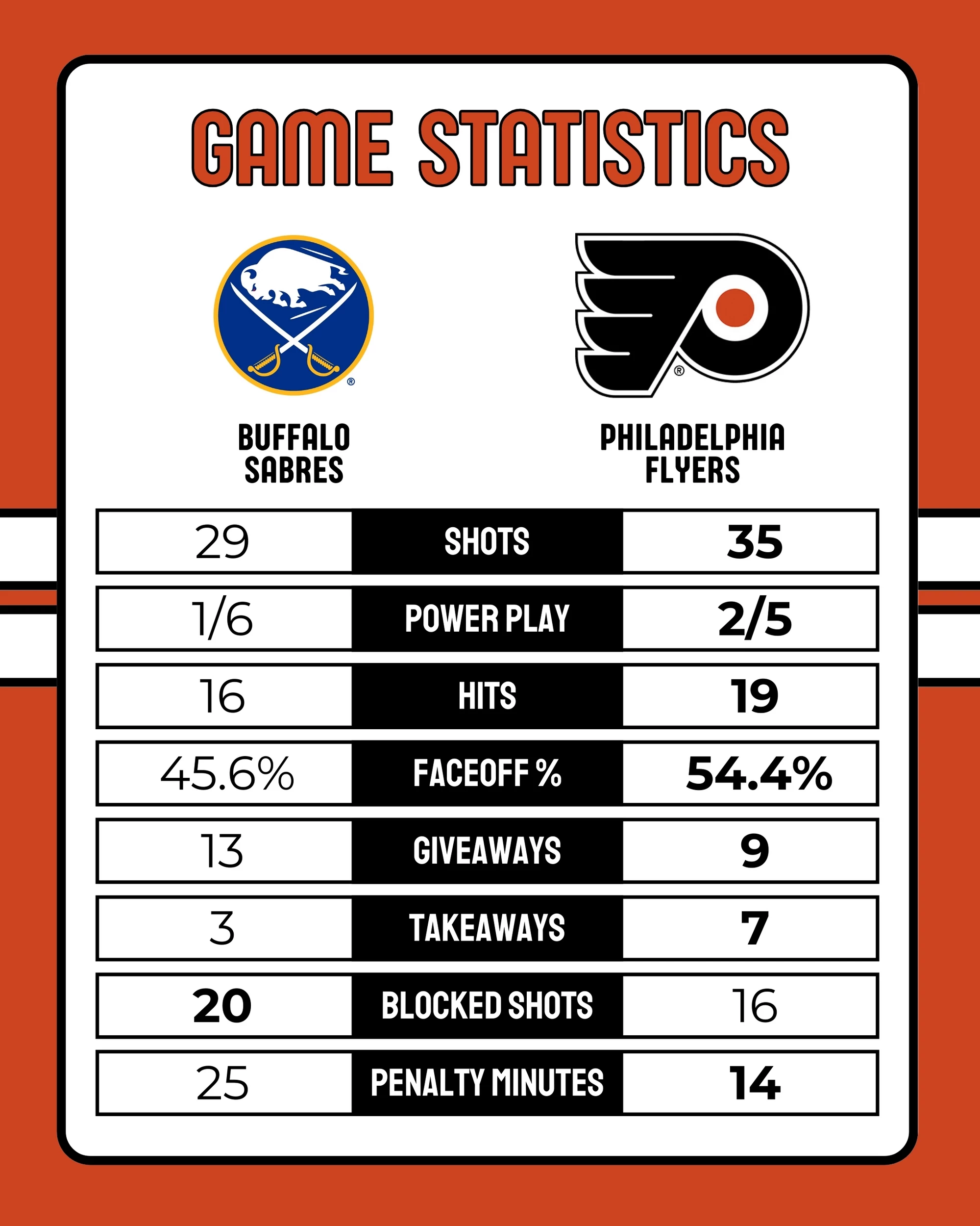 The Sabres pushed back from there, taking 14 of the next 15 shots on goal. Bowen Byran scored his sixth goal of the season at 11:48 to cut the Flyers lead to two.
