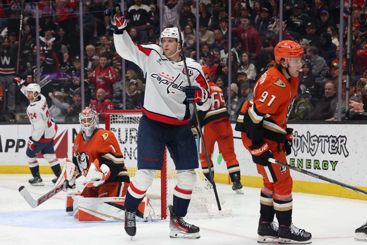 Mar 11, 2025; Anaheim, California, USA; Washington Capitals center Aliaksei Protas (21) reacts in front of Anaheim Ducks goaltender Lukas Dostal (1) and center Leo Carlsson (91) after scoring during the third period at Honda Center. Mandatory Credit: Jason Parkhurst-Imagn Images