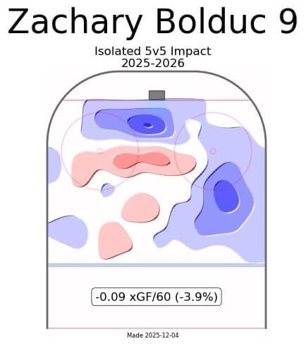 The reality, more than a quarter of the way through his first season in Montreal, is that Bolduc is still trying to adapt to his new environment, a new style of play and a new coach in Martin St. Louis, who wants more refinement in Bolduc’s defensive game. He is not consistently bringing that power forward game; he is not consistently being an effective F1 on the forecheck, the puckhound the Canadiens saw in him in St. Louis over the latter half of his rookie NHL season; and he is not consistently getting chances from the home plate area (heat map courtesy of HockeyViz).