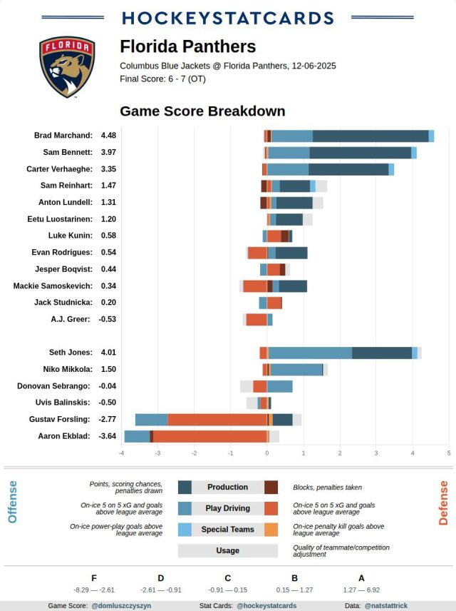 Florida’s power play would click again at 16:12 to even it up. After Sam Reinhart and Bennett exchanged passes, Reinhart sent the puck back to Jones and his wrister found the netting behind Merzlikins through a screen to give the big defenseman his fourth of the season.