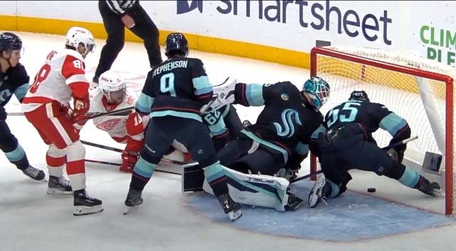 Time for the goalies to shine. First, Detroit’s Gibson makes a pair of sparkling saves off the sticks of Eberle and Lindgren. Then Seattle’s Daccord flashes out his glove to rob Alex DeBrincat.